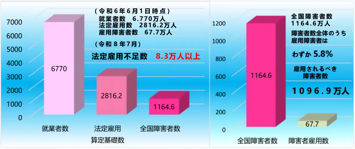 民間企業(常用労働者数40人以上)には、法定雇用率2.5%(令和8年7月からは2.7%)が義務付けられています。現在でも約70.4万人、来年には76万人の雇用が必要となる数字です。