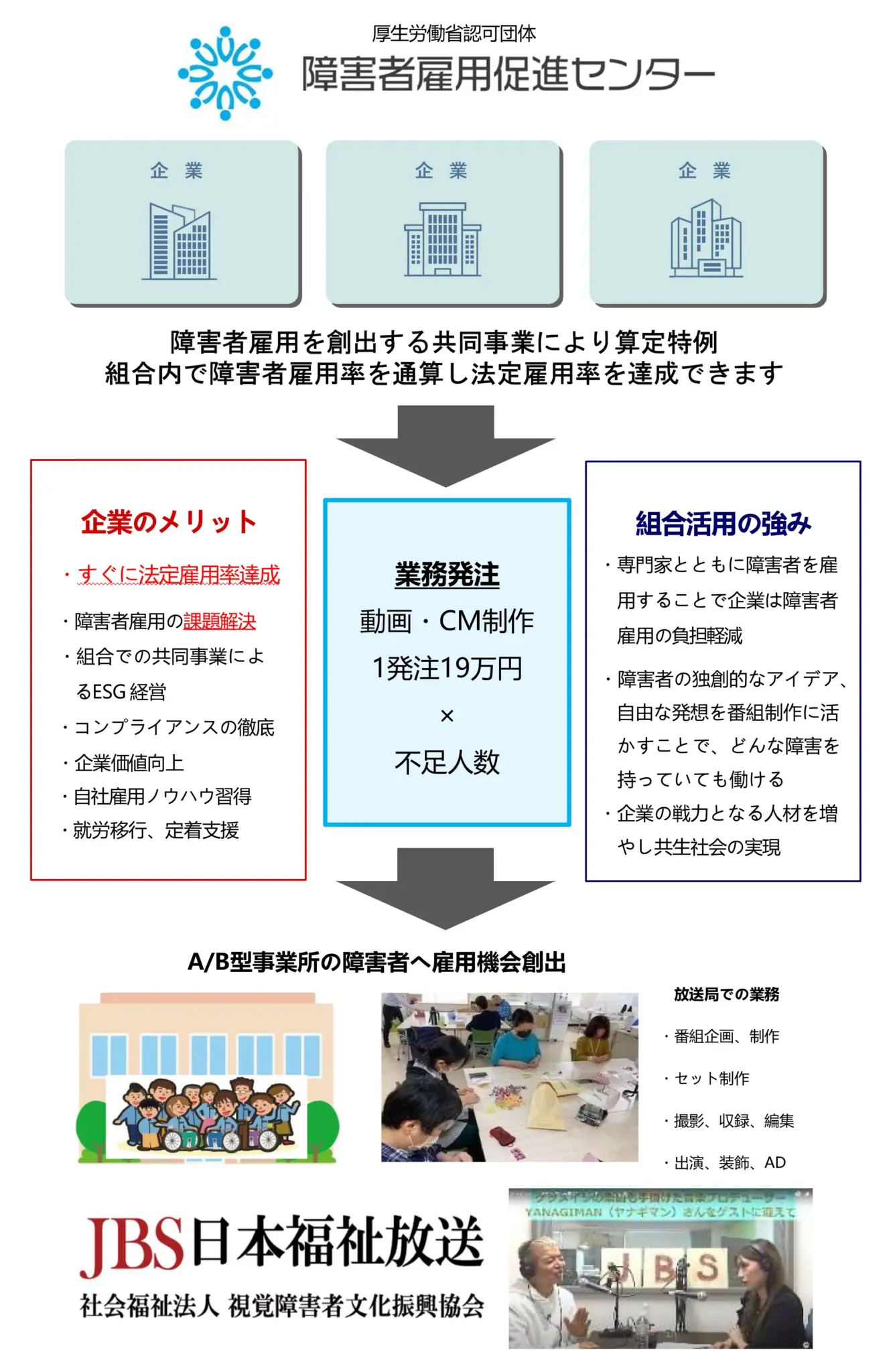 促進センターが提携するJBS日本福祉放送株式会社は、多くのA型・B型事業所と福祉関係機関と連携し、障害者の方が自分らしく働ける仕事と環境を創出。創意工夫を凝らした番組制作を通じて、誰でも参加できる「働く場」を提供しています。