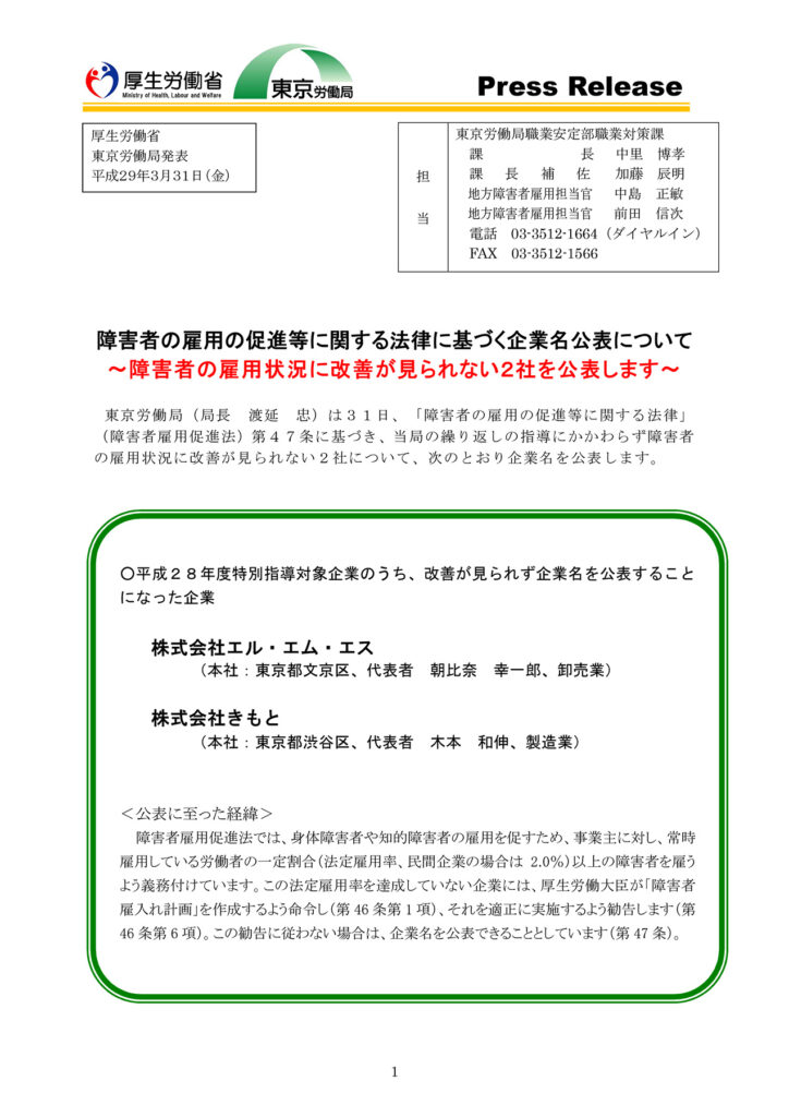 ※ 厚生労働省 障害者の雇用の促進等に関する法律に基づく企業名公表について