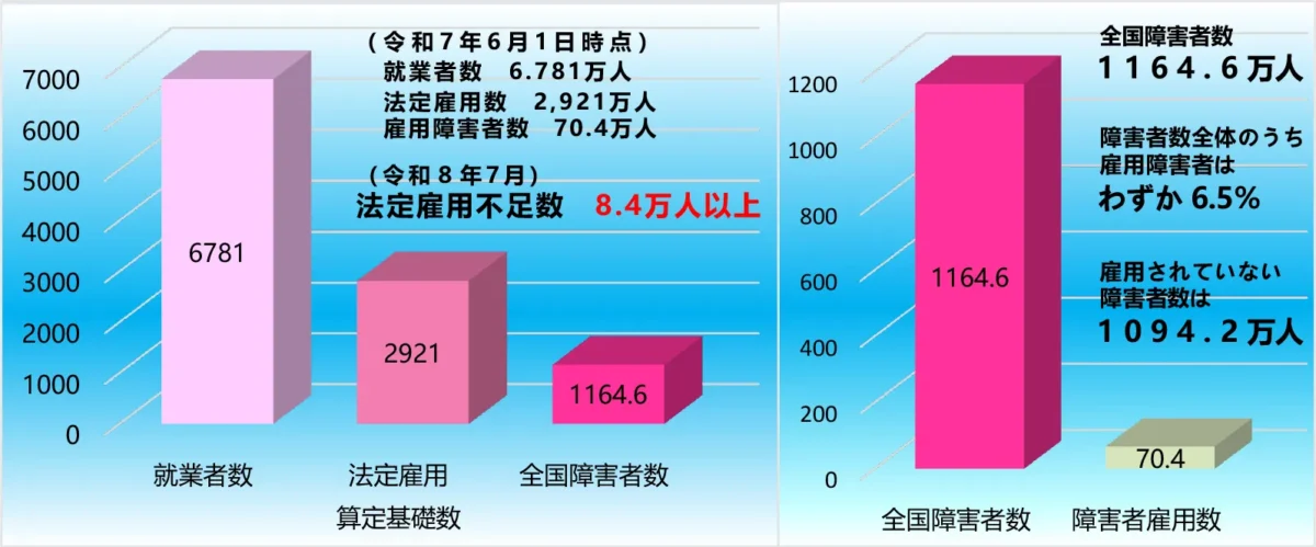 厚生労働省が公表した「障害者雇用状況の集計結果(令和7年6月1日)」によると、現在日本の就業者6,781万人のうち、障害者の雇用者数は僅か70.4万人。就業者全体の約1%にすぎません。