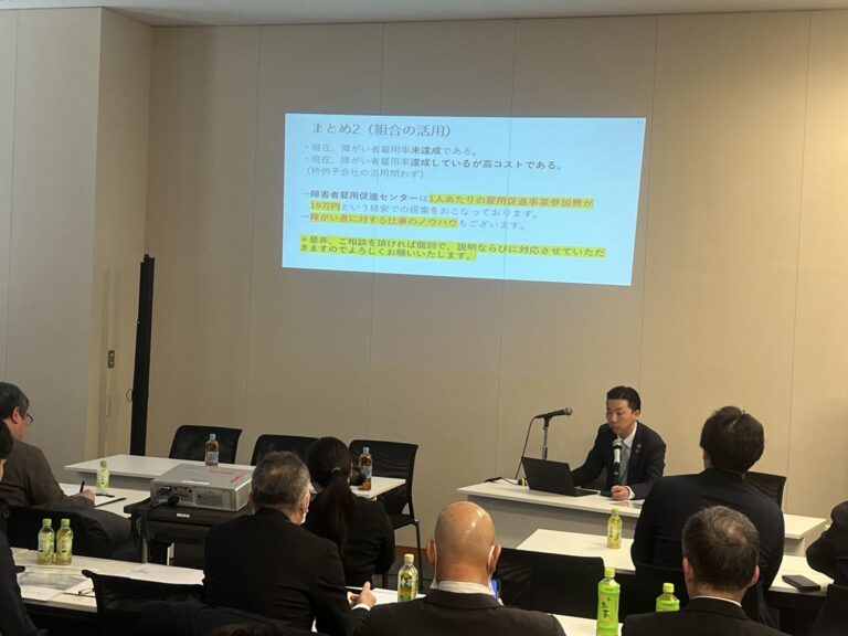 2025年2月28日、衆議院第二議員会館にて開催された第1回GCEA文化交流会において、当組合 理事の伊野達亮が登壇。「障がい者雇用促進の為の支援事業について」と題し、有限責任事業組合障害者雇用促進センターの活用について説明させていただきました。