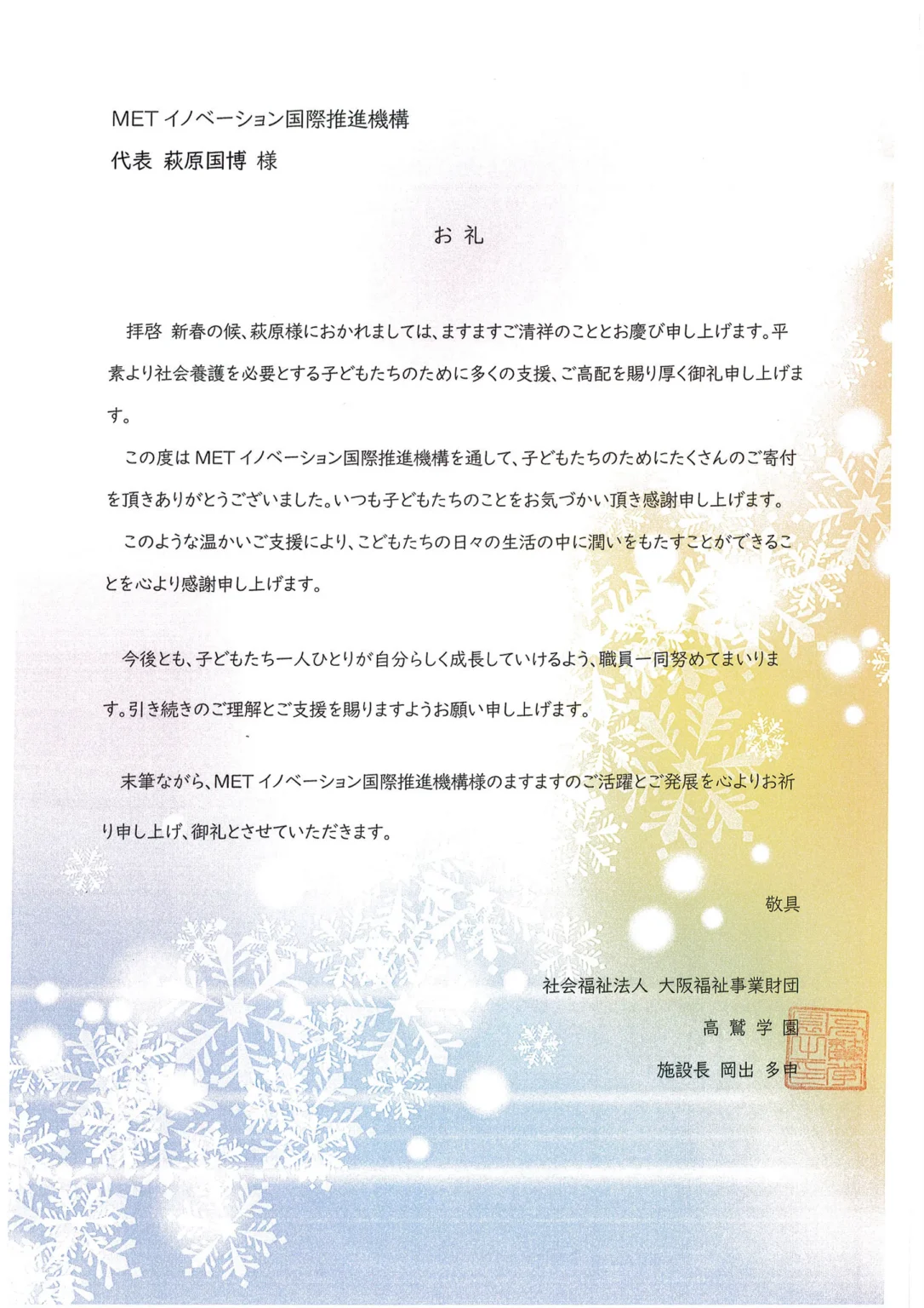 障害者雇用促進センターがその活動を応援している関連団体「METイノベーション国際推進機構」では、昨年末に、児童養護施設および障害児入所施設への年末寄付を実施いたしました。