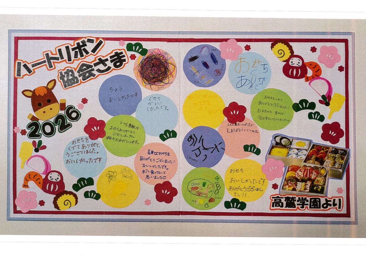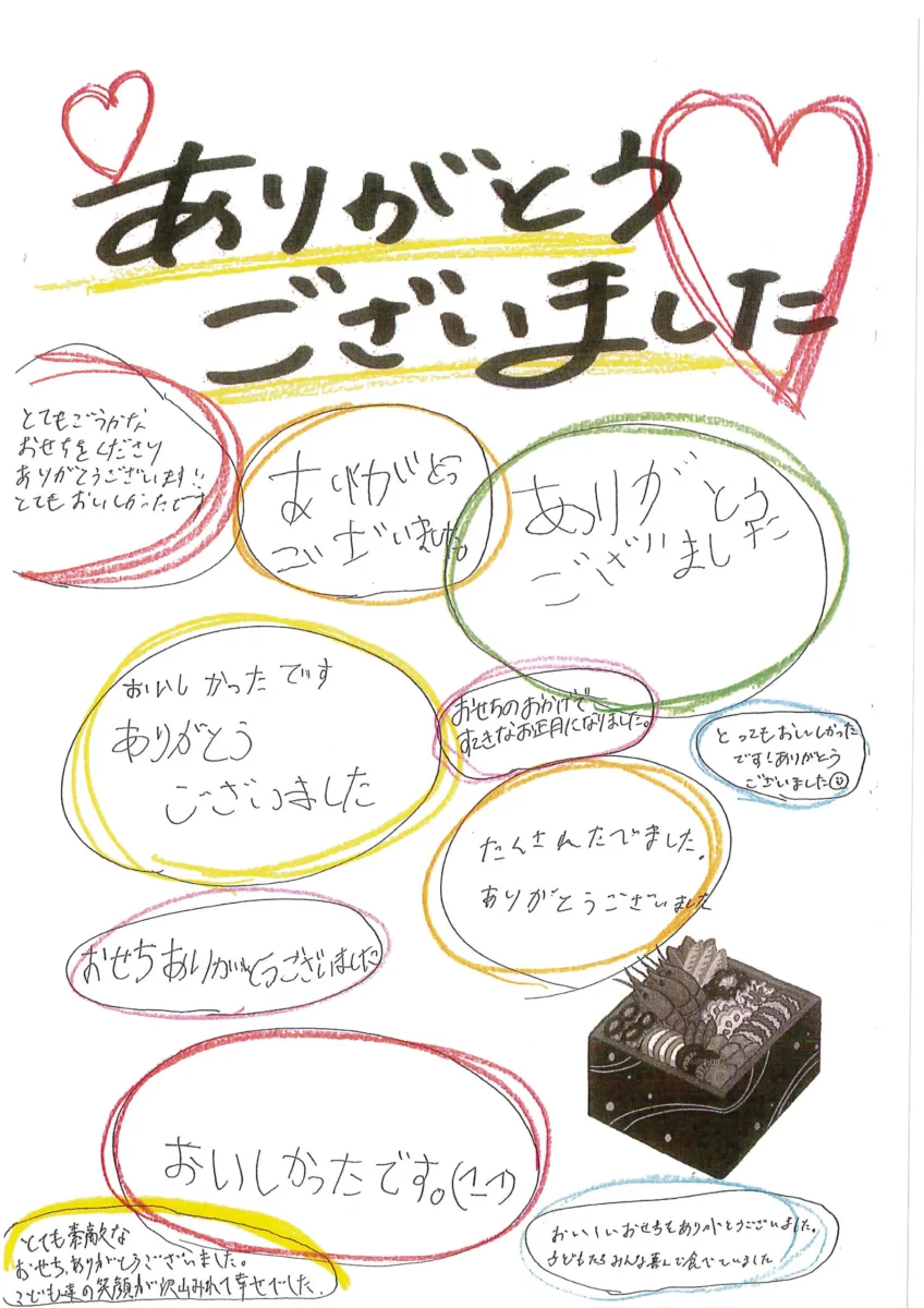 本活動では、高鷲学園、羽曳野荘をはじめとする児童養護施設・障害児入所施設など計9か所へ、おせち料理155個(620人前)をお届けいたしました。
